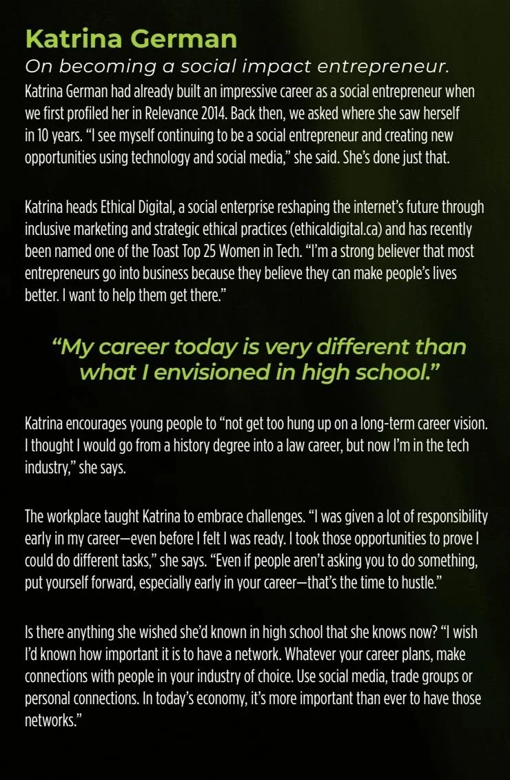 I'm honoured to share that I'm featured in Relevance Magazine's 20th Edition - a publication distributed through high schools across communities in Saskatchewan.